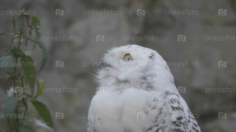 Снежная сова (Bubo scandiacus или Nyctea scandiaca), сидящая на палочке
