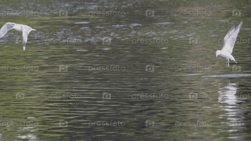 Чайка летит по поверхности воды со скоростью, чтобы поймать еду
