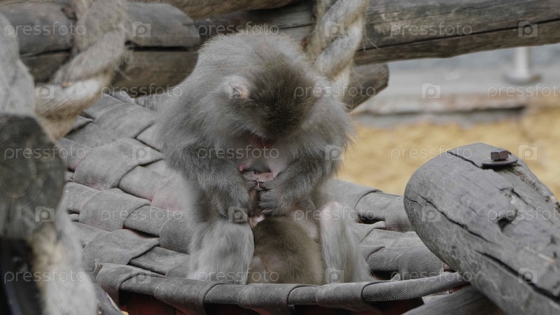 Мама японской макаки-снежной обезьяны заботится о малыше-обезьянке