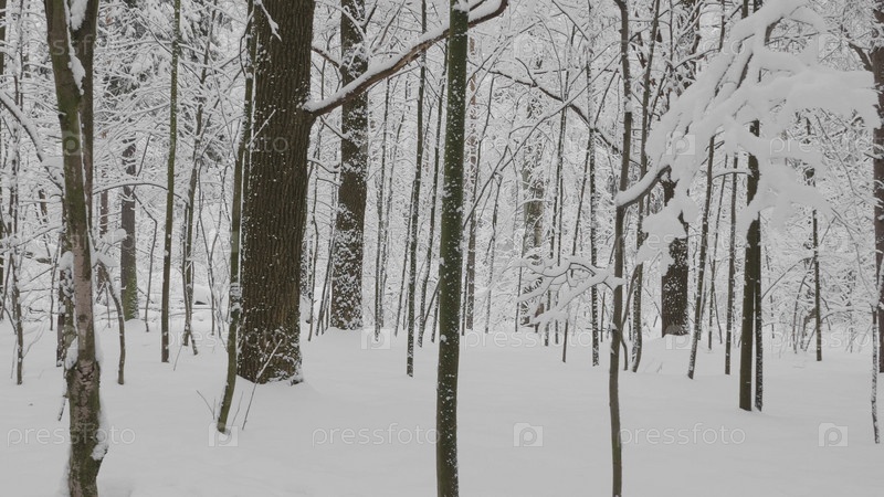 Зимний лес во время снегопада, замедленная съемка