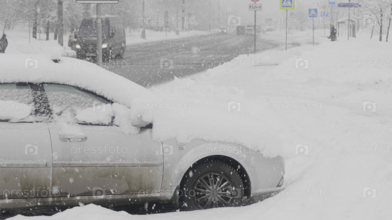Снег в городе на дороге с машинами