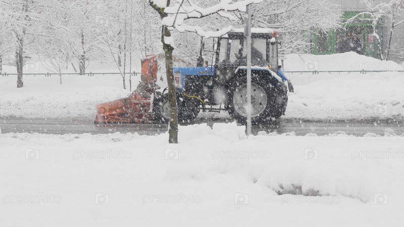 МОСКВА - 16 ЯНВАРЯ: Трактор чистит снег в поле 16 января 2018 года в Москве, Россия
