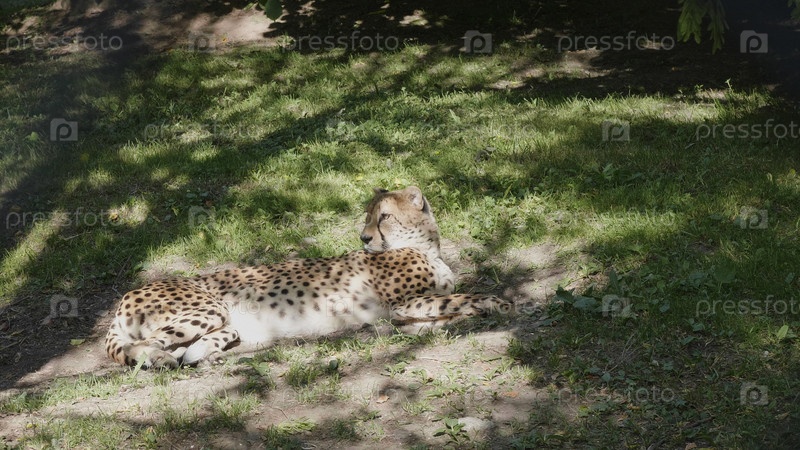 Леопард panthera pardus лежит на зеленой траве под деревом