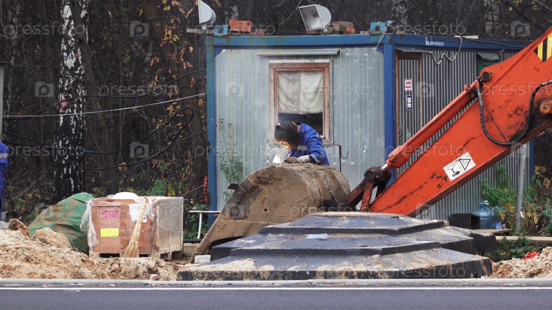 МОСКВА, РОССИЯ - 13 июля 2018 года: рабочие, сварщики, изготовленные ковшом электросварочного экскаватора