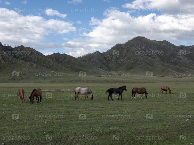 Лошади с жеребятами пасутся на пастбище в Горном Алтае