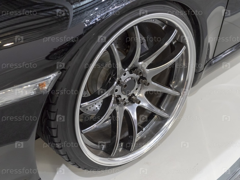 Крупный план черного низкопрофильного колеса с ободом автомобиля
