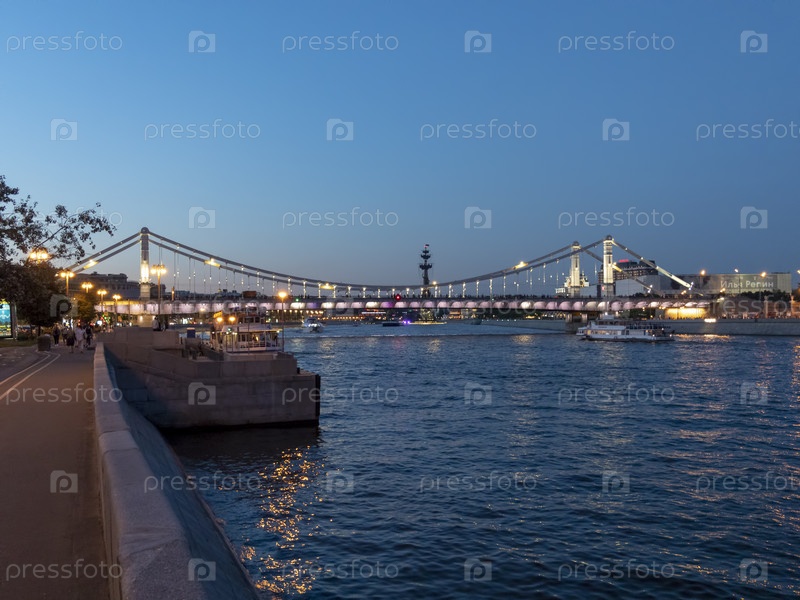 МОСКВА, РОССИЯ - 22 мая 2022 года: Вид на Крымский мост в Москве из парка Горького, популярной туристической достопримечательности и места для прогулок в Москве