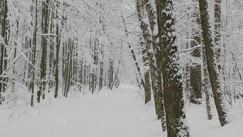 Зимний лес во время снегопада, замедленная съемка