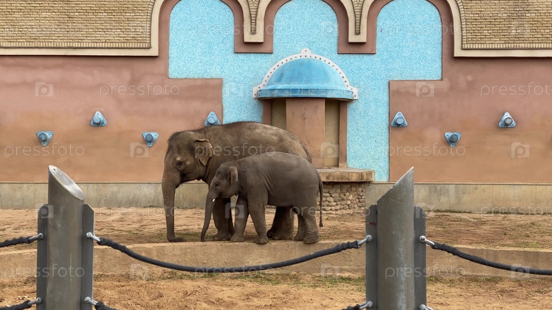 Мать и детеныш дикого азиатского слона гуляют