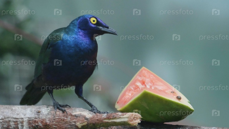 Скворец фиолетовый блестящий ест фрукты на ветке
