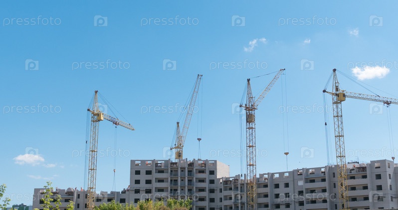 Промежуток времени строящегося здания, крана и красивых облаков без птиц