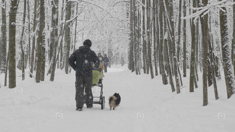 МОСКВА - 17 ЯНВАРЯ: зимняя прогулка отца с ребенком в коляске с собакой 17 января 2018 года в Москве, Россия