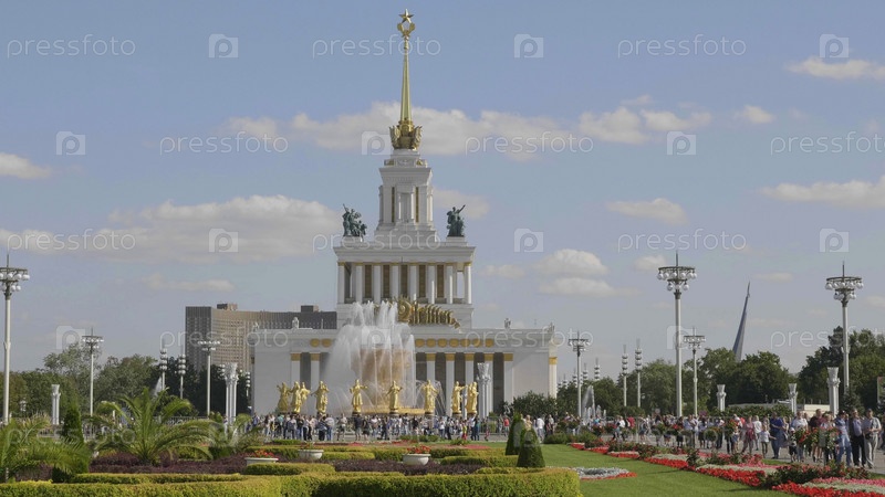 Москва, Россия - 01 МАРТА 2019 г.: Фрагмент центральной части фасада павильона Центральный на ВДНХ в Москве на фоне голубого неба