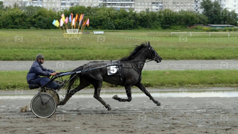 БАРНАУЛ - 22 АВГУСТА Скачки. Лошадь и всадник на скачках на трассе 22 августа 2018 года в Барнауле, Россия