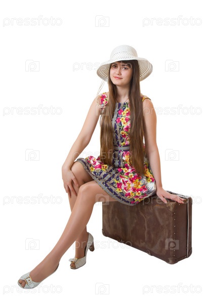 Красивая девушка сидит на старом чемодане