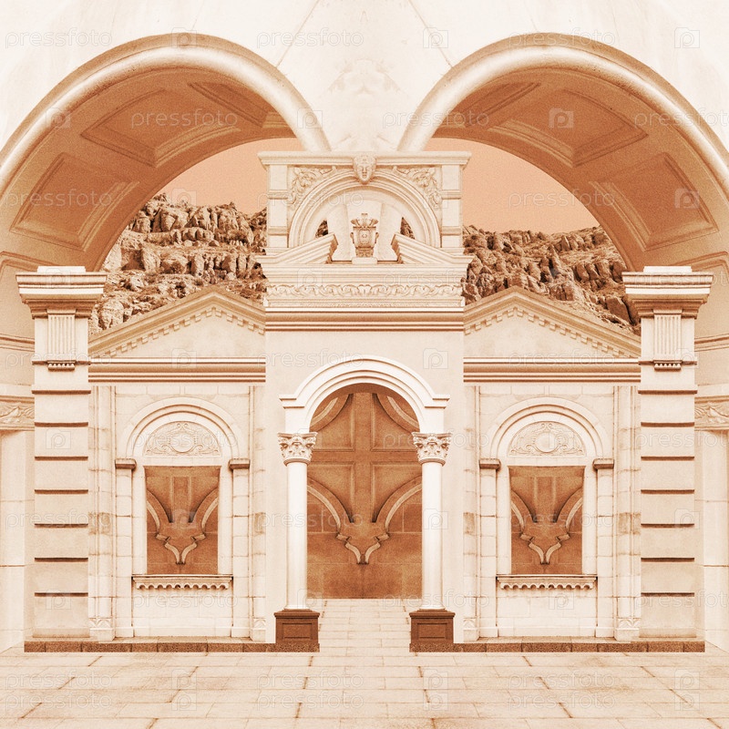 Сюрреалистический коллаж с элементами классической архитектуры. Художественный постер, концепция, обложка журнала. Античный городской пейзаж