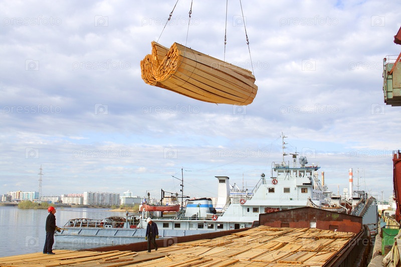 Выгрузка пиломатериала с судна. Якутский речной порт