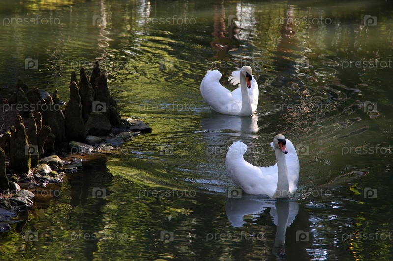 Два белых лебедя на пруду. Сочи. Дендрарий
