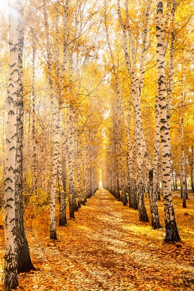 Осенняя березовая роща, освещенная ярким солнцем. Красочный лесной пейзаж из белых берез с желтыми листьями. Сезонная погода в лесу или парке