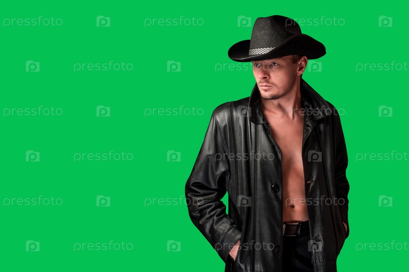 Ковбой в кожаной куртке смотрит в сторону. Небритый серьезный мужчина в шляпе, изолированный на зеленом фоне. Глядя. Культура Западной Америки