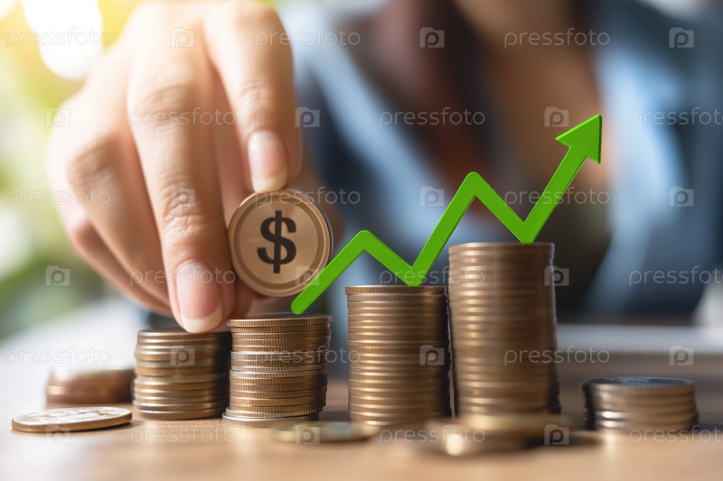 Женщина считает монеты в стопках со знаком доллара. Над ними находится зеленая стрелка, показывающая увеличение. Концепция увеличения прибыли, ставки, дивидендов, процентов. Экономия денег на будущее. Финансы, в