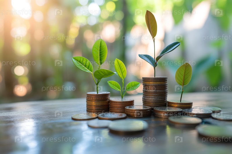 Растение, растущее из стопок монет. Финансы, инвестиции, депозиты. Концепция увеличения прибыли, обменного курса, дивидендов, процентов. Экономия денег на будущее