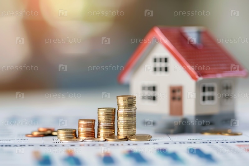 Дом и стопки монет расположены в порядке возрастания. Концепция покупки недвижимости. Финансы и инвестиции в недвижимость. Увеличение доходов и дивидендов, арендной платы, прибыли