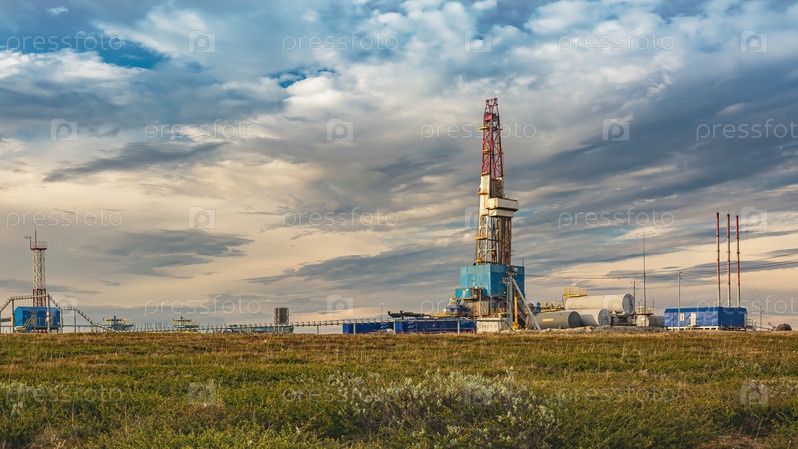 Летний пейзаж арктической тундры на фоне инфраструктуры для бурения скважин и добычи нефти и газа. На переднем плане растительность северной природы. Красивое облачное небо