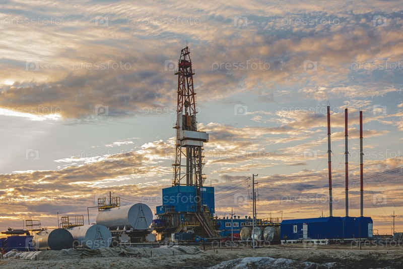 Инфраструктура и оборудование для бурения скважин и добычи нефти и газа. На заднем плане красивое небо в лучах заходящего солнца
