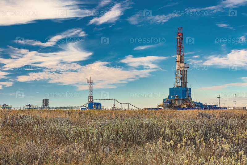 Весенний пейзаж арктической тундры на фоне инфраструктуры для бурения скважин и добычи нефти и газа. На переднем плане заросли северных кустарников
