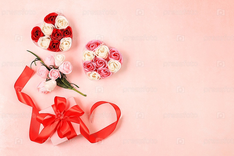 Красивые розовые цветы в коробке с сердечком. подарок и букет на светлом фоне. Абстрактная цветочная композиция, весенний фон или баннер, концепция праздника. Открытка ко Дню матери,