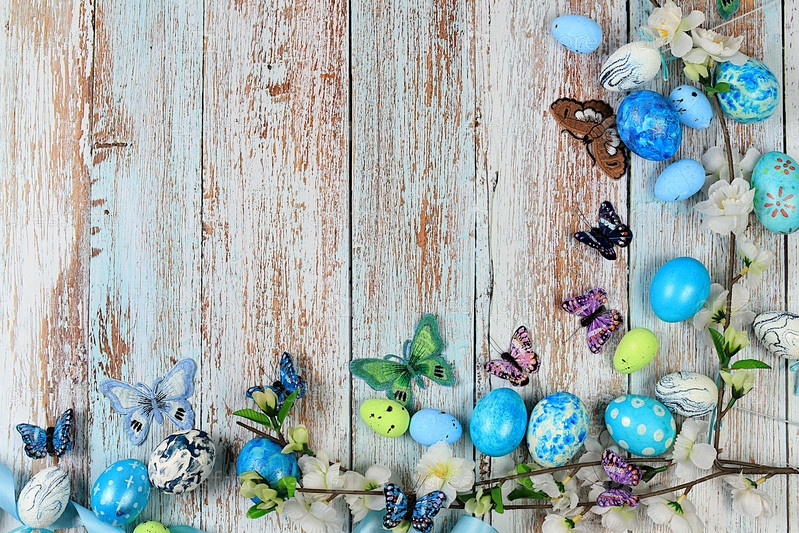 Концепция счастливой Пасхи, композиция с украшенными пасхальными яйцами, бабочками и ветвями яблони. баннер или реклама для экрана или магазина, шаблон для дизайна, весенняя открытка,