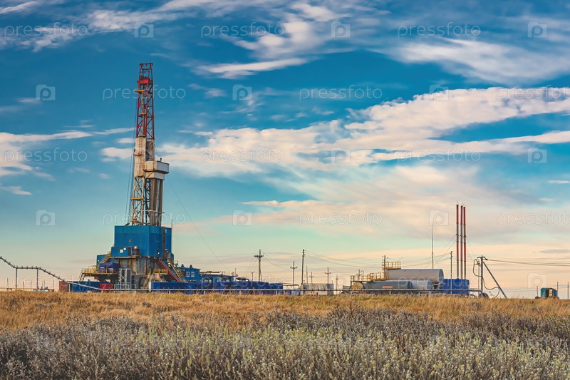 Весенний пейзаж арктической тундры на фоне инфраструктуры для бурения скважин и добычи нефти и газа. На переднем плане заросли северных кустарников