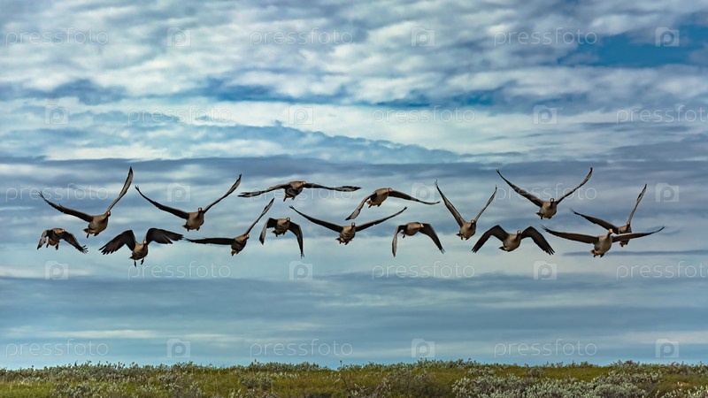 Дикие гуси летают на фоне текстурированного облачного неба. Птицы летят прямо на фотографа