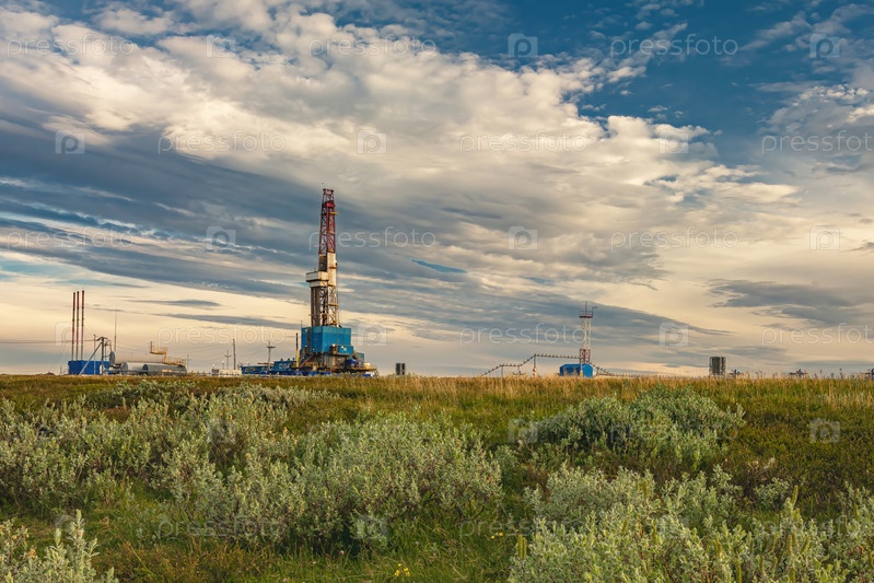 Летний пейзаж арктической тундры на фоне инфраструктуры для бурения скважин и добычи нефти и газа. На переднем плане растительность северной природы. Красивое облачное небо