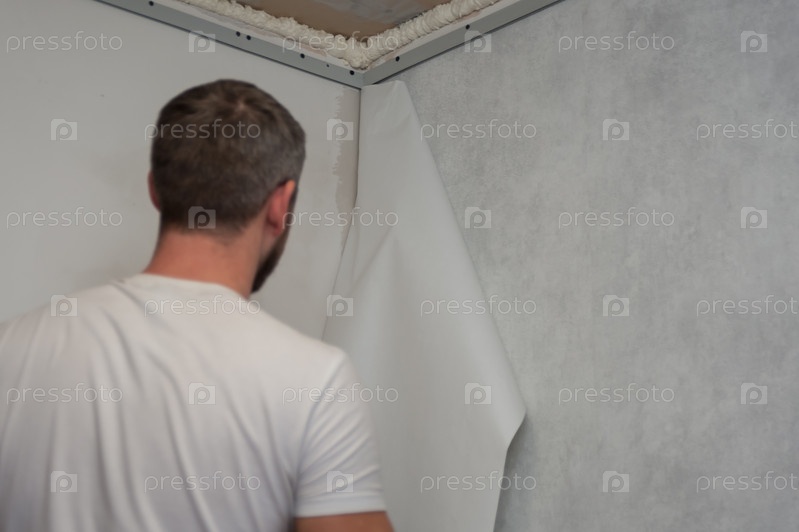 30-летний парень клеит обои на стену