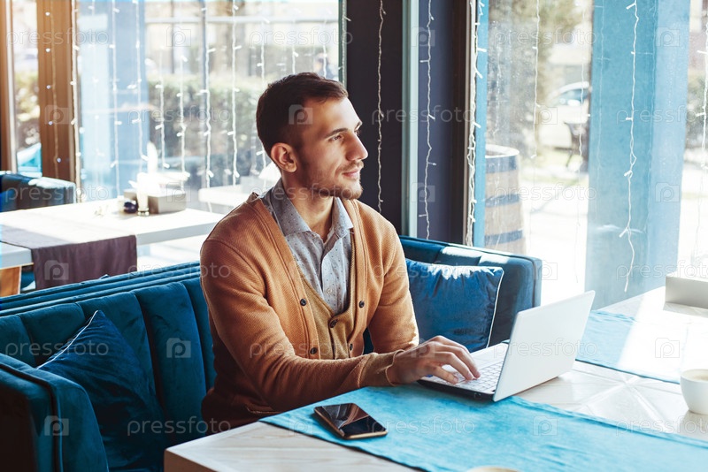 Молодой человек работает за ноутбуком в уютном кафе. Концепция бизнеса и коворкинга. Портрет мужчины