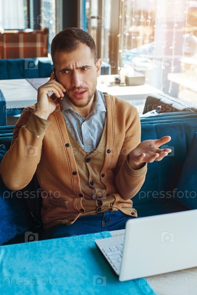 Эмоциональный молодой человек сидит в кафе, работает за ноутбуком, жестикулируя, разговаривает по телефону. Портрет молодого человека