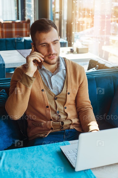 Молодой человек сидит в кафе, работает за ноутбуком, разговаривает по телефону. Портрет молодого человека