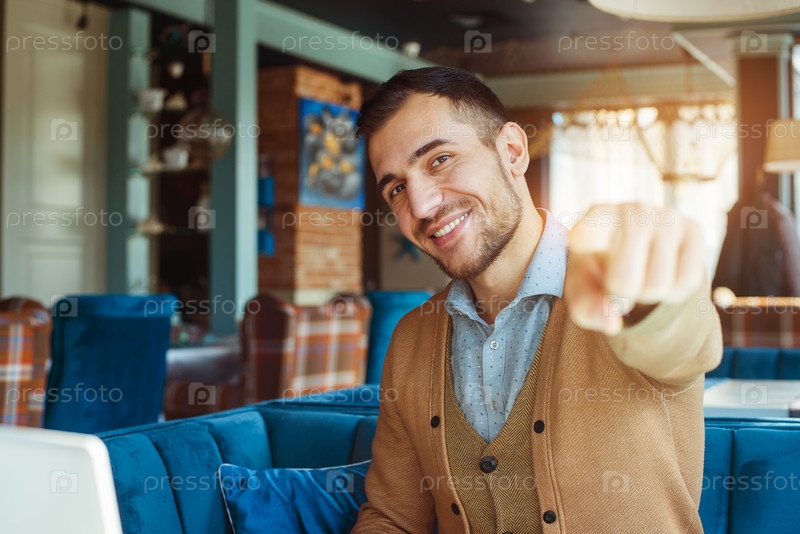 Молодой человек находится в уютном кафе. Мужчина улыбается и указывает пальцем на зрителя. Мужской портрет