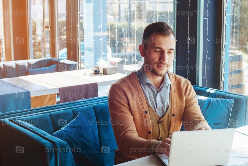 Молодой человек работает за ноутбуком в уютном кафе. Концепция бизнеса и коворкинга. Портрет мужчины