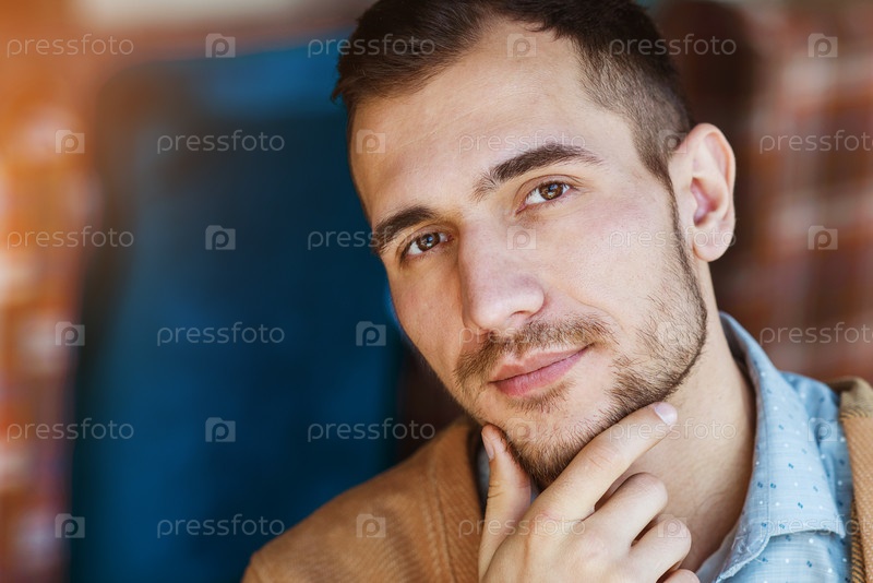 Портрет успешного человека, который находится в кафе. Мужчина улыбается. Портрет крупным планом