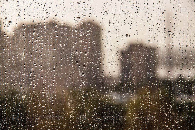Панорама жилого комплекса в санкт-петербурге через стекло в каплях дождя