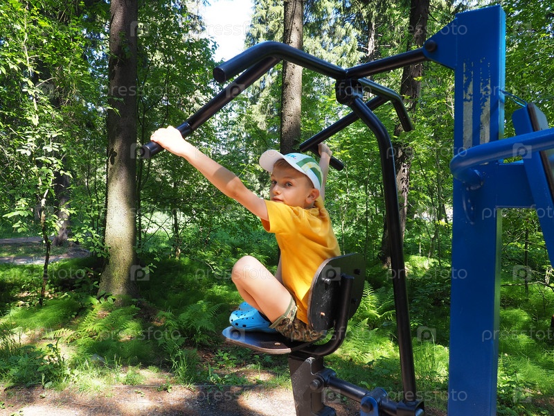 8-летний блондин занимается спортом и бодибилдингом в лесной полосе на спортивном инвентаре или тренажере. Мышцы рук и спины. Ребенок смотрит по сторонам во время тренировки