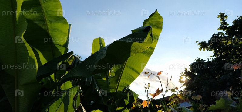 Красивые ярко-зеленые банановые листья на фоне голубого неба. Тропические мотивы. Концепция праздника под пальмами