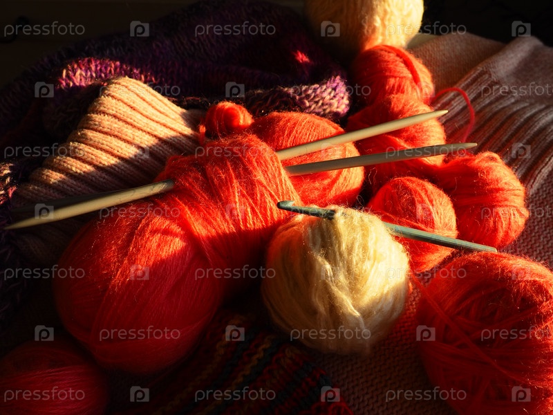 Запутывается, рычит. Клубки пряжи и ниток, вязаная одежда, спицы и крючки. Розовые, фиолетовые, красные и белые нитки в мотках. Расфокусированное изображение. Вязание и плетение как хобби