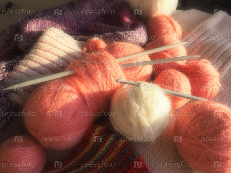 Запутывается, рычит. Клубки пряжи и ниток, вязаная одежда, спицы и крючки. Розовые, фиолетовые, красные и белые нитки в мотках. Расфокусированное изображение. Вязание и плетение как хобби