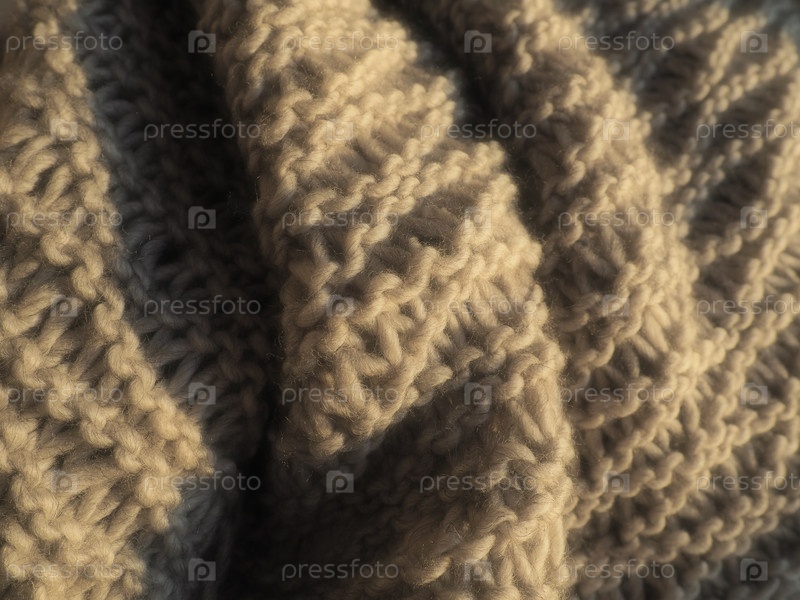 Вязаное изделие из объемной полиакриловой пряжи бежевого или коричневого цвета. Пышная коробка машины. Вариант теплого гардероба на осенне-зимний период. Теплый шарф, свитер или джемпер