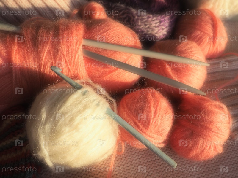 Запутывается, рычит. Клубки пряжи и ниток, вязаная одежда, спицы и крючки. Розовые, фиолетовые, красные и белые нитки в мотках. Расфокусированное изображение. Вязание и плетение как хобби