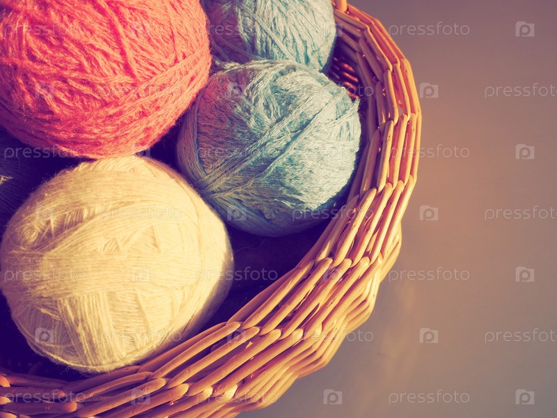 Мотки шерстяных и акриловых ниток. Вязание как хобби. Аксессуары, клубки пряжи и нитки белого, розового и голубого цветов в плетеной корзине. Копировать пространство